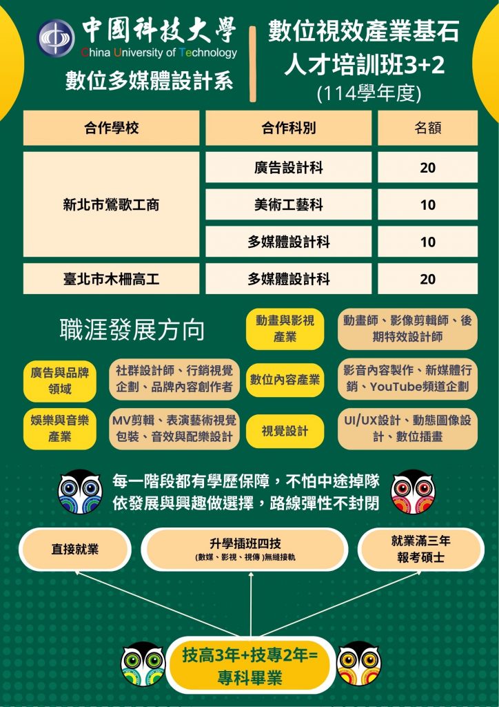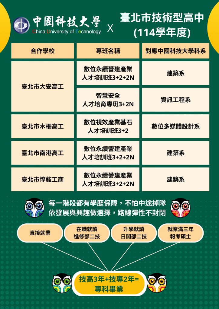 為鼓勵尚未有明確興趣分流的學生落實職涯規劃,教育部推動由技高與技專校院合作辦理3+2新五專模式專班,提供入學管道的多元選擇。不同於五專學制或技高建教合作班,專班生無須提前於職場實習或工作,而是在現行技高課程架構下,透過與科大二專部共同規劃銜接式的實作課程,幫助學生重視專業技術能力養成,同時經由技高三年和二專兩年在校的扎實學習及訓練,培養學生的就業即戰力。